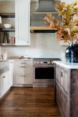 The kitchen became the heart of the design. We leaned on ceiling height, cohesive finishes, and a meticulously planned cabinet layout to stretch the space. The result: a kitchen that functions and feels like it belongs in a much larger home, but without stretching the intimacy that makes a tiny house special. In a space overflowing with little "wow" moments, it's difficult to pick a favorite design element. Perhaps it's the separate coffee bar that oozes charm, or the cozy central island stained a rich wood tone to accent the surrounding creamy cabinets. Maybe it's the lighting selections - the travertine sconces and patina brass pendants add to the ambiance, and we adore their smaller scale balanced against the large custom range hood. This space-anchoring find was the result of a perfectly timed trip to the Kitchen and Bath show in Las Vegas, and we were thrilled with the ability to customize the shape and metal finish for a rangehood that truly looks like art. A thoughtful blend of open shelving and glass cabinets prevents the kitchen from feeling congested, and allows for display of Dawn's treasured sunflower dishware. For a design firm that thrives on a good kitchen project, this one will forever be a favorite!