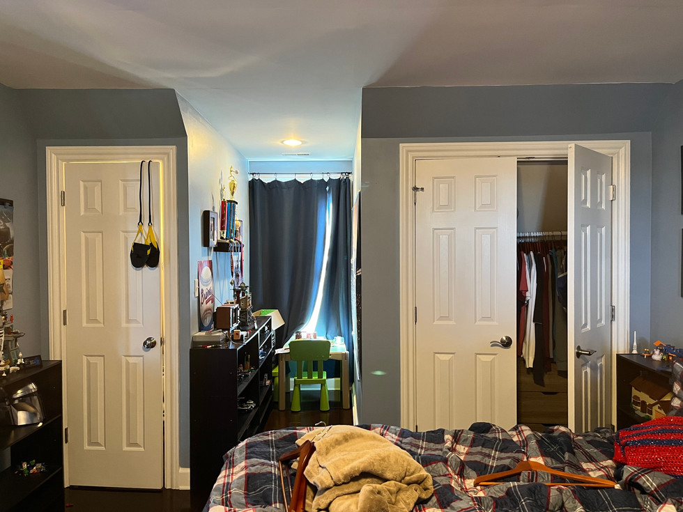 Now on to the second floor, where improving layouts would prove more difficult without the ability to add space. Working with tight spaces and window dormers added an extra layer of complexity, though it's a space planning challenge we welcomed! On the right side of the floor, the teenage daughter was ready to take her room from "little princess" to a suite more reflective of her personality. She occupied two small rooms, one for her bedroom and the other for crafts and dance practice. By removing the dividing wall, and reconfiguring closets in both areas, we were able provide a spacious central base for all her needs, from ballet bar to art supply and record storage.