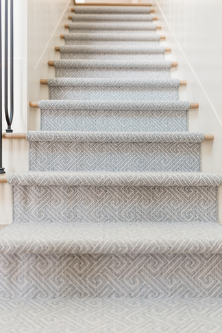 In the cozy foyer, the stairwell serves as a key focal point. To elevate it, we added a clean white wainscot on the walls, a black wrought iron railing, and stained treads to echo the new floors. Beyond the style upgrade, the main requirement was an accommodation for their aging dog who had been struggling with climbing the bare steps. By adding a geometric carpet runner to the hardwood steps, we eliminated the dog's risk of slipping and landed both safety and style!