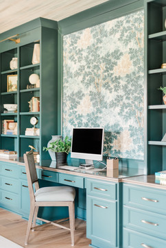 With our client's non-profit organization building steam, she was desperate for more space in the home office. Not only did she need considerably more storage, she also wanted to delineate a meeting area separate from her desk. By expanding out into the former porch area, we were able to create an entire wall of built-ins for her work zone. The new larger foot print not only granted her a dedicated meeting table, but also a cozy reading nook. Our client adores any shade of blue, so we opted for a color-drenched palette with jewel toned walls, trim and cabinetry. Accents of wood and stone soften, with an unexpected pop of texture on the grass cloth ceiling. We chose a wall mural behind the desk to break up the large span of cabinetry, and contrasted the bold colors with light drape and upholstery choices. The modern champagne finish light fixture commands attention, creating an ethereal feel against the grass cloth. Finally, a new set of iron and glass French doors provide privacy for small meetings while balancing the room's feminine energy. The study is the renovation's crown jewel, with every element combining purpose and style, and Mrs. O'Neal is quick to share it's her favorite part of the entire renovation!