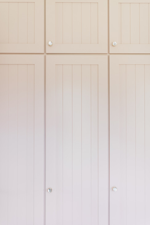 The room's centerpiece, a custom-built shelving unit with an integrated desk, offers functionality and style. Its classic gold pulls add a touch of warmth and sophistication against a delicate peachy pink finish- a tone we love for being not too pink, but just pink enough! When we returned to take photos, seeing this spot full of all her treasures, posters, and personality thrilled us the most! But the smile at the sight of a true dream room in use was second only to seeing her point shoes delicately hung on the new ballet barre. The mini dance studio comes complete with wood-toned vinyl flooring to provide a surface for perfecting those pirouettes. The bed, a golden brushed metal frame, nestles against windows that flood the room with natural light. Neutral bedding accented by a patterned bolster pillow keeps the look clean and fresh, yet fun. Overhead, a whimsical crystal and gold light fixture with branching arms adds a magical sparkle to the space, perfectly capturing our client's spirit. This thoughtfully designed bedroom isn't just a place to sleep - it's a retreat where she can dream and create!