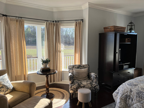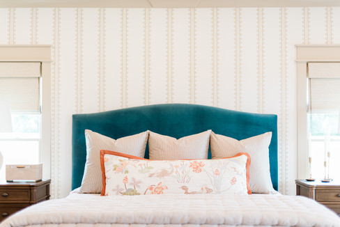 The primary bedroom also benefitted from the wraparound porch reduction, with the new square footage improving furniture layout and granting an expansive walk-in closet. Sometimes, a simple relocation can make a significant impact. With the bay window eliminated, we were able to switch the bed to the opposite wall for a stunning statement as soon as you enter the room. The deep blue velvet bed pops against the tan and white striped wallpaper on the accent wall. The extra square footage enabled us to provide ample windows for natural light, use oversized chests as nightstands, and add a seating area in front of the bed. That soft brown leather sofa (one of our favorite elements in the room) is the ultimate relaxation after a long day. Custom operable drapes, selected in a linen stripe that compliments the wallcovering, serve to block the bright morning sun and complete the room. We have always loved designing bedrooms, the details are like frosting on a cake. Every element adds depth, from the luxuriously layered orange and earth toned bedding, to the moody, richly-hued painting with framed in gold. The O'Neal primary bedroom now holds a special place as one of our favorites. We're excited to share that we'll be bringing the rest of the suite to completion later this year, so stay tuned for primary bathroom updates!