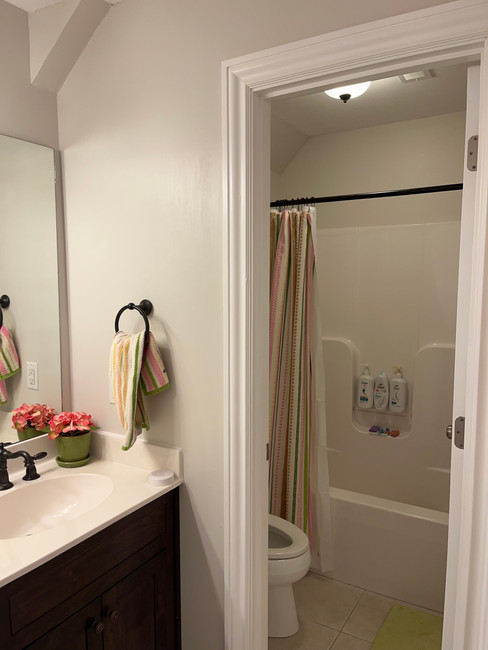 While planning the daughter's bathroom, we learned that storage would be key for the budding skincare guru, whose countless products were overtaking her current vanity. First we removed a partition between the shower and vanity area to make the small bath more cohesive. We added upper cabinets that extend from the counter to the ceiling, providing ample space for her many lotions and potions. This afforded a charming mirror inset with wall sconces and a much tidier counter top. The soft pink wallpaper speaks back to the bedroom, while sophisticated gold fixtures add a touch of elegance. One of our client's main requests was for shower selections that would be easy to clean, so it was out with tiny grout lines, and in with large-scale floor tiles and slabs in the walk-in shower. The finished bathroom strikes a balance between youthful charm and timeless style.